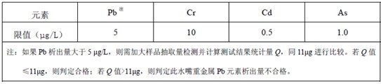 (1)GB/T 17219-1998《营生常饮水输配水紫装及加固内容的安全性评价指标规范起来》首要任务对水嘴中镉、铅、砷、汞、铬等四种巨资属的元素的挥发量应当要求,要求表单提交如表1如下: