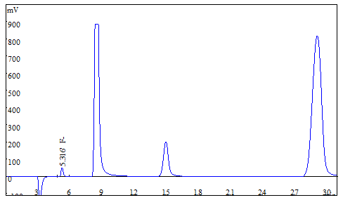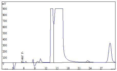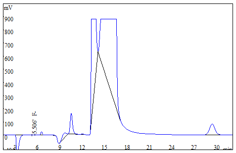 将大米、茶叶试样别离粉粹后过筛,各称取0.25g(切确至0.0001g),于氧弹熄灭仪停止熄灭,冷却后定容,经0.22μm的水系滤膜过滤后上机获得样品谱图,以下图3、图4所示;食用油样品间接称重后停止氧弹熄灭,测试获得的谱图如图5所示;糊口饮用水间接上机后获得样品谱图详见图6。此中大米、茶叶、食用油中氟离子的测定成果均低于体例检出限,同时对4种试样停止了加标处置,加标收受接管率在95.6%~102.3%之间。测试数据详见表2。